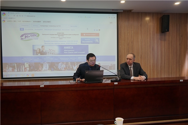 此后双方举行中俄国际交通合作座谈会。学院领导和各个专业、学生管理的相关老师参加座谈。丛森书记和方建军院长介绍了北京联合大学拟将中俄合作项目办成教育部示范项目的目标,希望双方共同努力,为一带一路战略培养合格的建设者。加尔金校长表示来到学院印象深刻,感受到了大家的热情,看到了学生渴望求知的眼神,希望拓展合作领域,互访互派,不局限于学生,始终保持开发的态度,共同进步。双方针对学生管理等方面进行了经验交流,并谈到可以促进学生双向留学,中方选送汉语教师教授中文,便于俄罗斯学生来华学习。